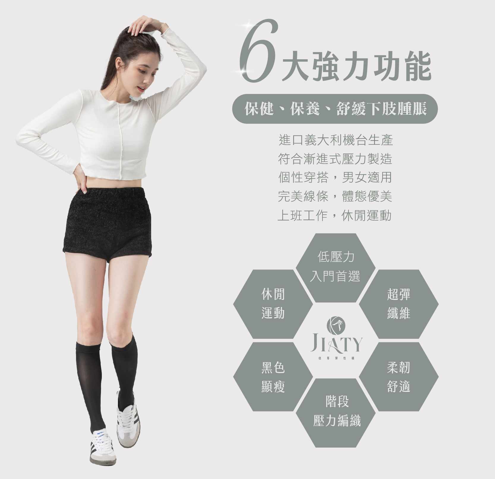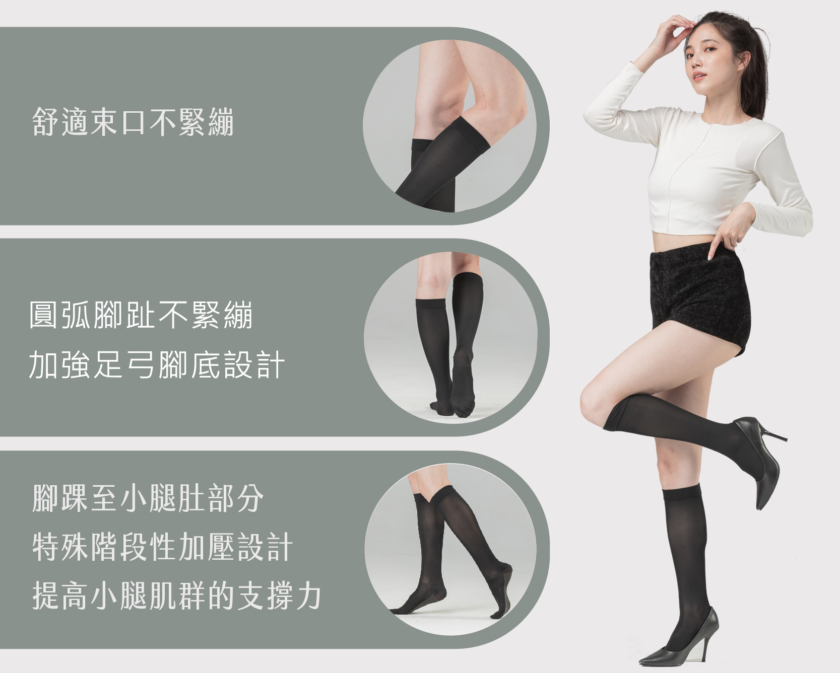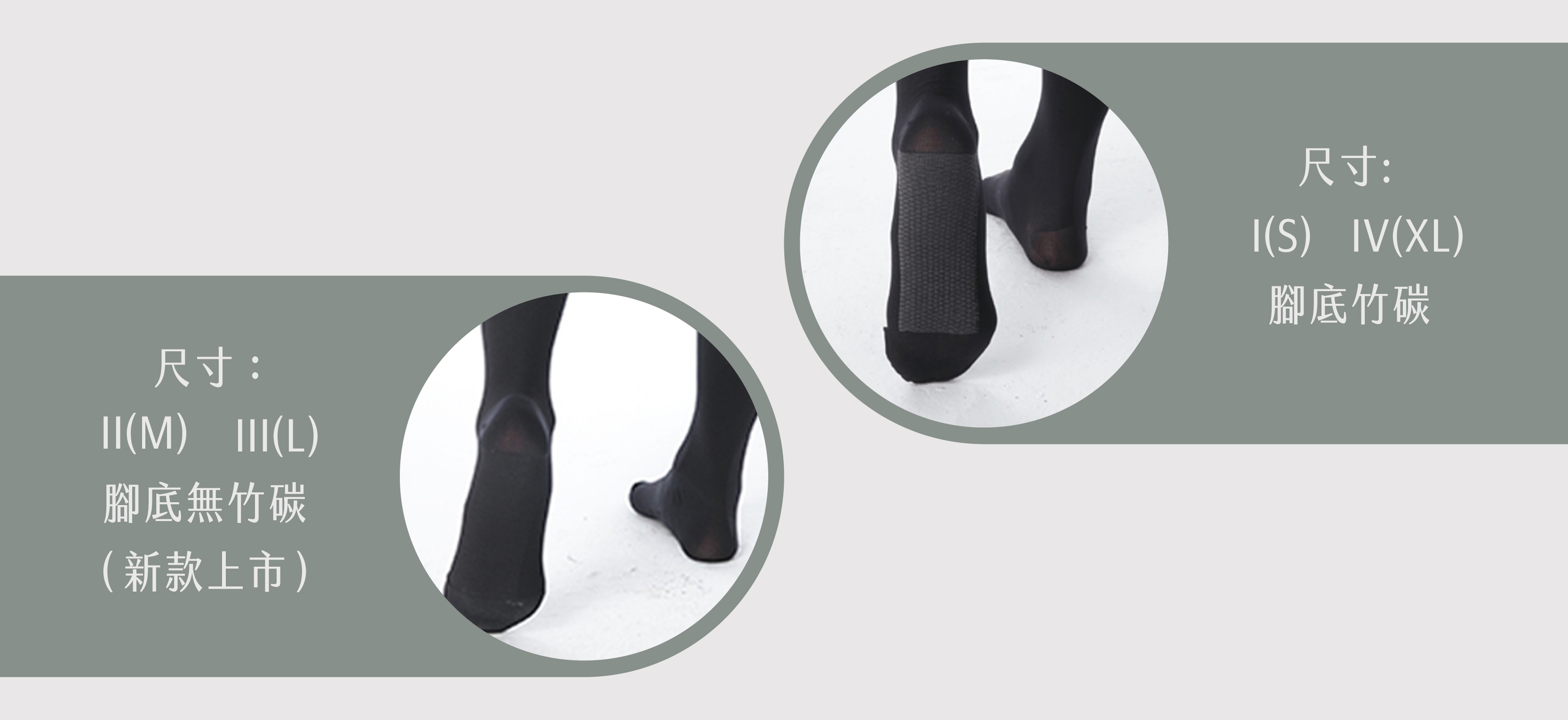 超彈力纖維、顯瘦、染料絲紗均通過無毒檢驗、腳底止滑、竹炭除臭