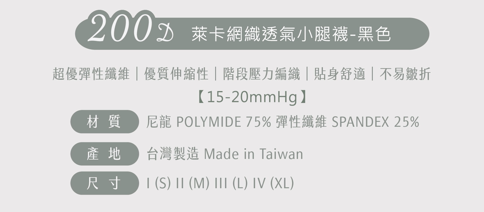 商品:【200D】15-20mmHg萊卡透氣小腿襪-黑色